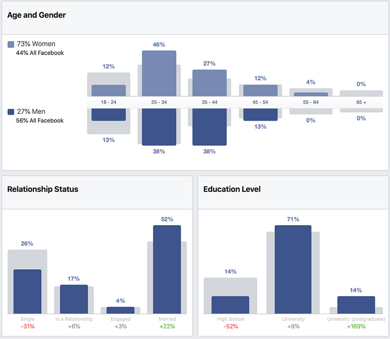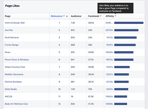 În cazul în care ai deja o pagină de Facebook, poți afla informații relevante despre fanii tăi. Deși fanii nu sunt același lucru cu clienții, reprezintă un bun punct de plecare. Aici poți afla ce tip de pagini urmăresc, date demografice, informații despre starea civilă și studiile absolvite (în măsura în care datele oferite de utilizatori sunt reale), comportamentul pe Facebook și date despre dispozitivele folosite.