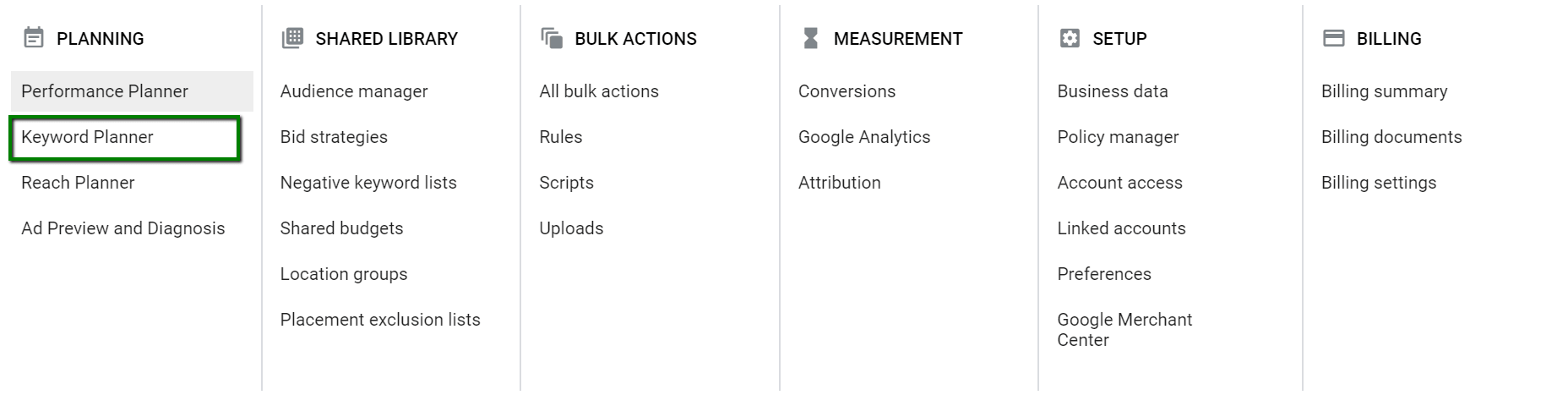 Keyword Planner-ul poate fi găsit în contul de Google Ads accesând meniul Tools & Settings -> Planning.